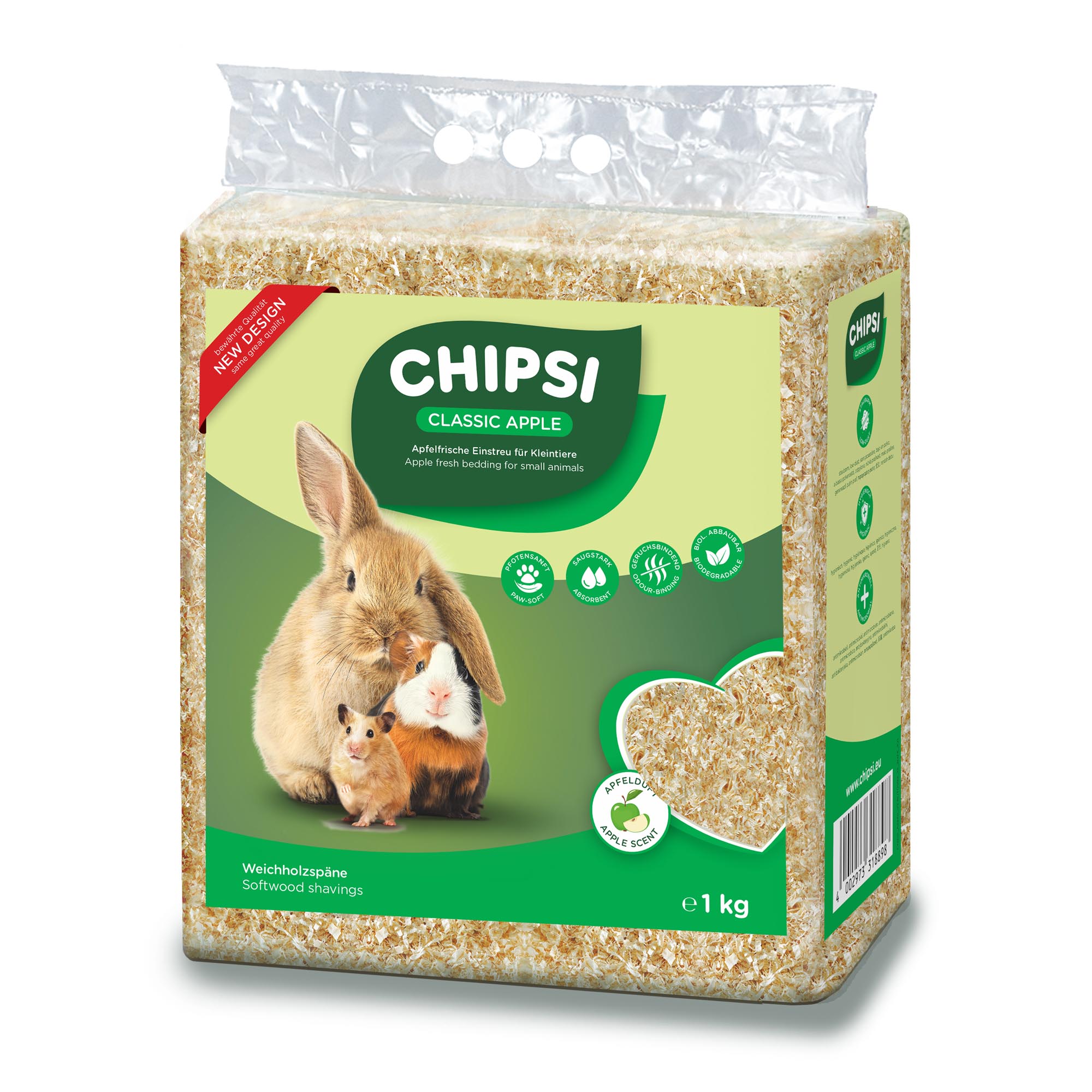 Chipsi Green Apple 1kg. Â Fantastic apple scented! Chipsi is a refreshingly different natural organic fibre bedding that is hygienic, super absorbent, odour binding and dust-free with anti-microbial properties. Â It is made from renewable forrests of spruce and fir (not pine)! Â Suitable for rodents and a variety of other small animals. Â Highly compressed and will greatly expand when fluffed out from the pack. Â Available in 1kg and 3.2kg.