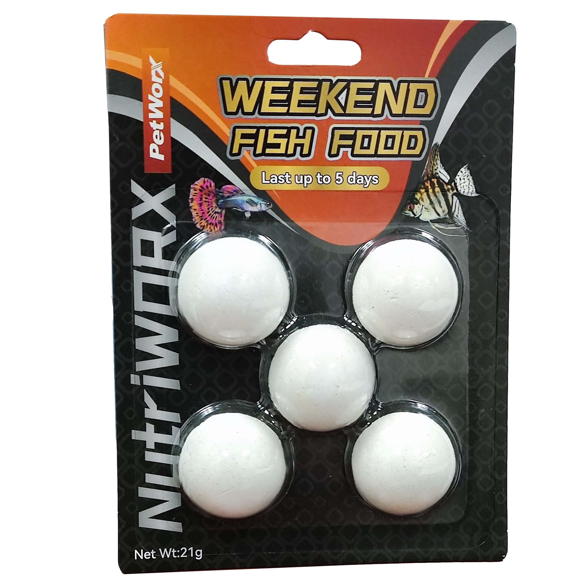 Nurtiworx Weekend Fish Food 21g lasts up to 5 days.